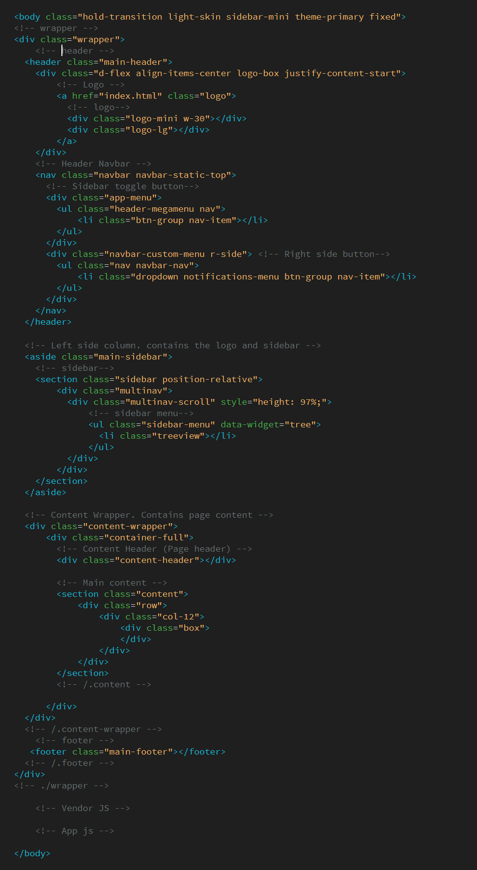 .fixedto get a fixed header and sidebar. - Collapsed Sidebar: use the class